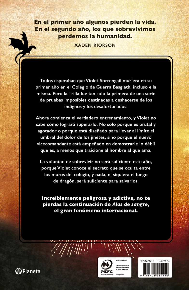 Todos esperaban que Violet Sorrengail muriera durante su primer año en el Colegio de Guerra Basgiath, incluso ella misma. Pero la Trilla fue tan solo la primera de una serie de pruebas imposibles destinadas a deshacerse de los indignos y los desafortunados.