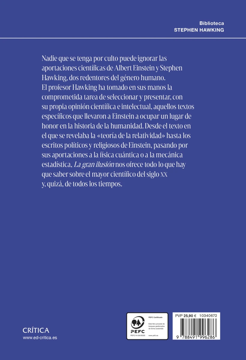 Stephen Hawking ocupó la cátedra Lucasiana de Matemáticas que en otro tiempo ostentó Newton en la Universidad de Cambridge. Reconocido universalmente como uno de los más grandes físicos teóricos del mundo, el profesor Hawking escribió, pese a sus enormes limitaciones físicas, docenas de artículos que suponen en conjunto una aportación a la ciencia que aún no somos capaces de evaluar adecuadamente. A sus primeras obras de divulgación, Historia del tiempo. Del Big bang a los agujeros negros (Crítica, 1988) y El universo en una cáscara de nuez (Crítica, 2002), se le suman Brevísima historia del tiempo (Crítica, 2005) y El gran diseño (Crítica, 2010) –escritas con Leonard Mlodinow–, las antologías A hombros de gigantes (Crítica, 2003), la edición ilustrada de esta última obra (Crítica, 2004), Dios creó los números (Crítica, 2006), Los sueños de los que está hecha la materia (Crítica, 2011), Breve historia de mi vida (Crítica, 2014) y las conferencias emitidas en la BBC, recopiladas en Agujeros negros (Crítica, 2017).